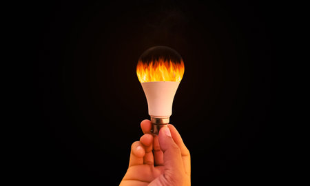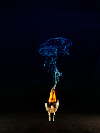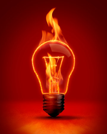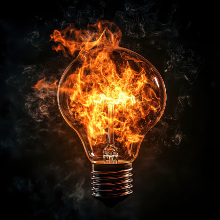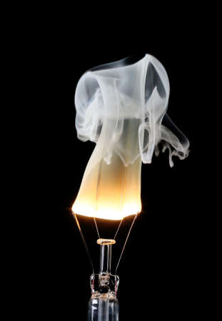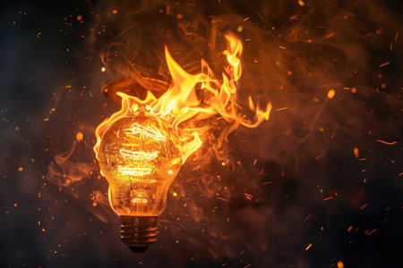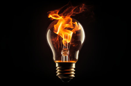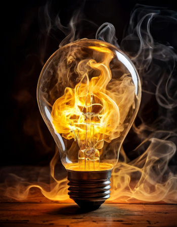 Lightbulb with a fiery filament surrounded by smoke, symbolizing burning ideas or energy AI