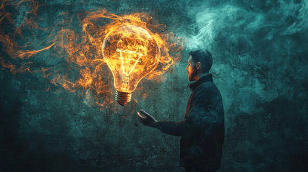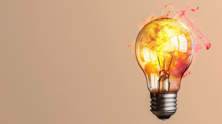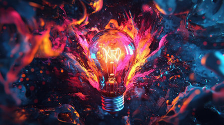 Glowing light bulb emits vibrant flames and colorful smoke, symbolizing creativity and innovation. warm hues create inspiring atmosphere, perfect for ideas and imagination