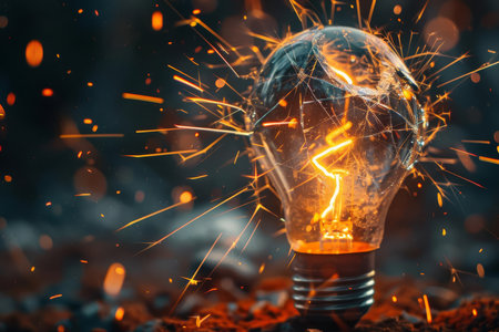 An abstract representation of a lightbulb shattering with neon sparks flying out, symbolizing the intensity of breakthrough ideas