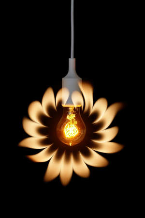 Isolated illuminated incandescent lamp with fire sparks on a black background
