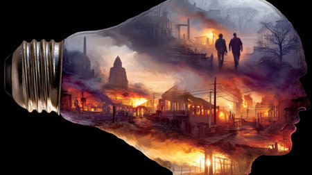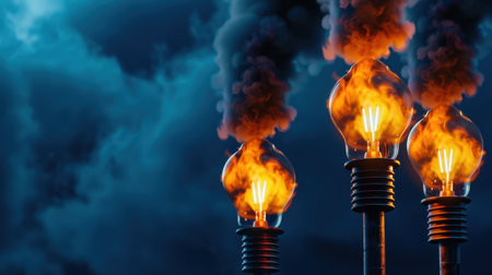 This captivating image showcases flames erupting from light bulbs, surrounded by dark smoke against a moody, cloudy backdrop, conveying intense energy.