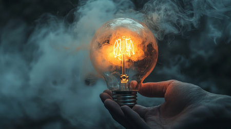 Close-up of a glowing vintage light bulb held in a hand, surrounded by dramatic smoke and moody lighting. Captivating and symbolic imagery.