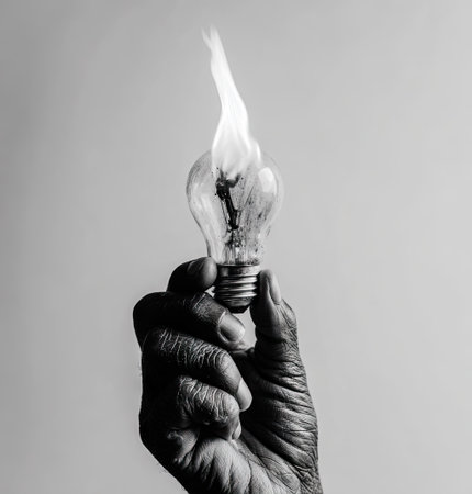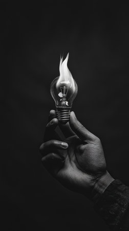 A grayscale image displays a hand holding a burning light bulb. The composition is simple, with a focus on texture and form. The photograph presents a contrast between light and shadow. Suitable for use in conceptual projects, illustrating ideas and inspiration.