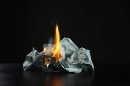 Crumpled paper ball burns with fire on a black background. Bad idea. Failure.