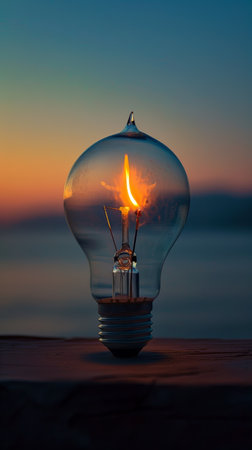 A glowing filament flickers within an antique bulb, with swirling smoke-like designs on a neutral backdrop, evoking ideas of inspiration and inventive energy.