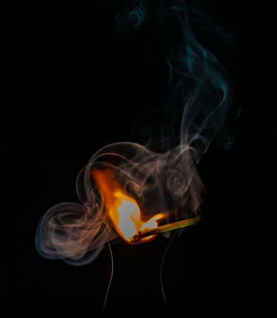 Burning match with blue smoke over black background