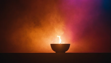 A close-up of a professional camera lens next to a dramatic flame on a dark textured surface, creating a moody vibe.
