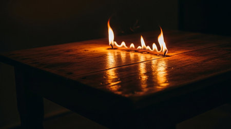 A close-up shot captures the intense glow of small flames burning on a dark, rustic wooden table. The fire casts a warm, orange and yellow light, creating dramatic reflections on the polished surface. The background is dark and out of focus, emphasizing the fiery spectacle. The scene evokes a sense of danger and raw energy.