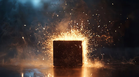 A dramatic image showcasing a black cube surrounded by vivid sparks and flames, creating an intense visual effect that conveys power and energy.