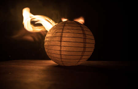 Beautiful paper lantern glowing on wooden table in dark. Selective focus