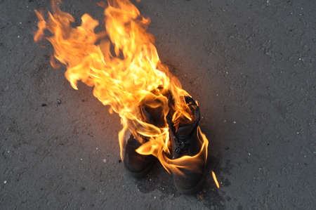 Burning shoes close-up. Burning work shoes shoes. Special shoes on fire.