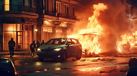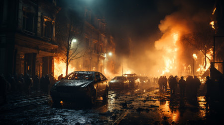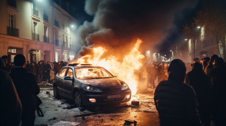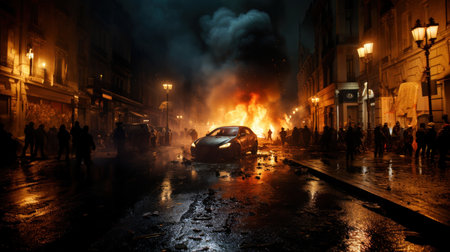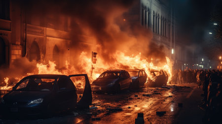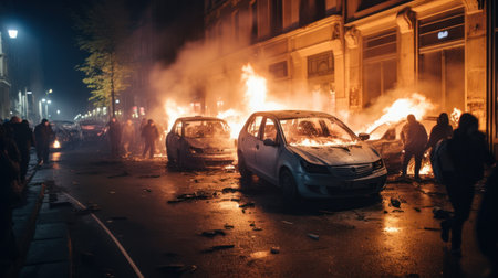 Riots, protesters burn cars. Illustration Generative AI