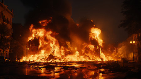 Intense fire burning on street with metal barriers and smoke during night emergency protest riot demonstration violent urban conflict scene.