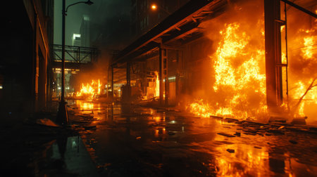A multi-storey building stands engulfed in flames and thick black smoke, with debris scattered around, showcasing the aftermath of a devastating fire explosion in an urban setting. Generative AI.