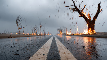 A captivating perspective of a rain-slick road lined with burning trees, set against a moody sky, evoking a sense of drama and nature's extremes.
