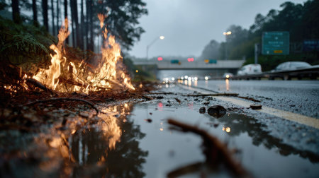 A striking image captures flames igniting dry debris beside a busy highway during rainy weather, creating a stark contrast with wet asphalt.
