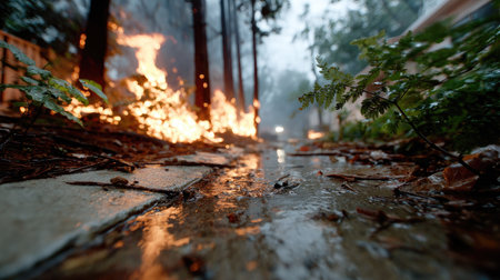 A dramatic scene capturing flames flickering on a rainy road, with fallen branches accentuating the reflections in puddles, showcasing nature's power.