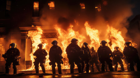 Revolutionary riots and protests. burning building and cars in the city. special force police with equipment catching protesters in the night. Generative Ai