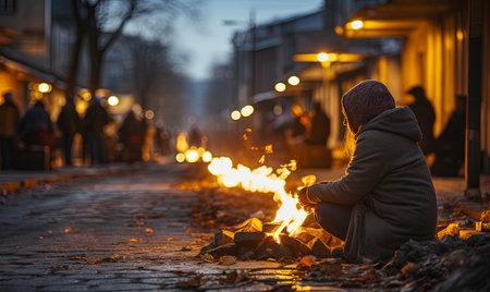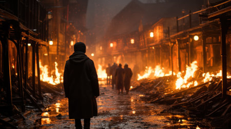 A man walking down a street in front of a fire. Generative AI image.