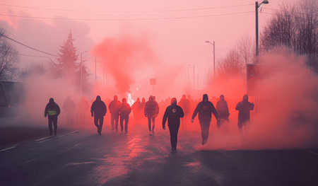 Riot civil unrest protest. Smoke people. Fictional person. Generate Ai