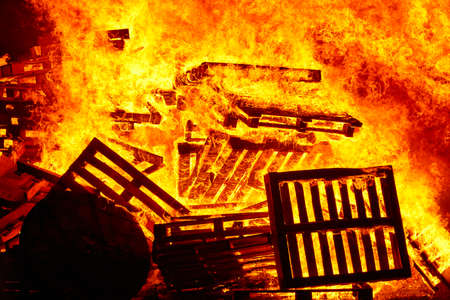 Big red and orange flames raging fire, wood and embers in the fire on a background of flames
