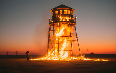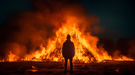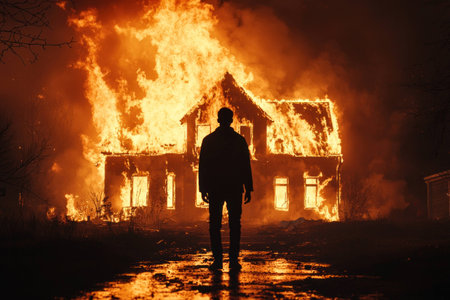 A silhouette of a person standing before a burning house, surrounded by flames and smoke, evoking feelings of devastation and loss in a dramatic fire scene