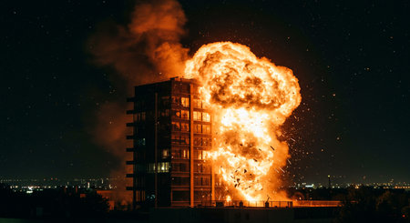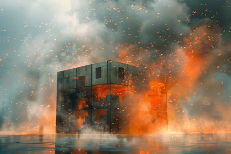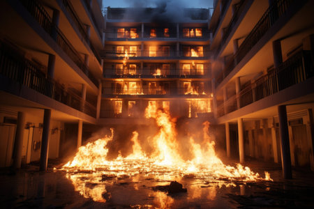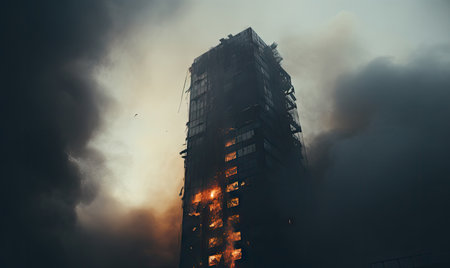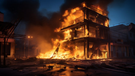 A multi-storey building stands engulfed in flames and thick black smoke, with debris scattered around, showcasing the aftermath of a devastating fire explosion in an urban setting. Generative AI.