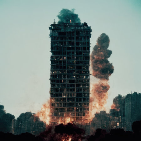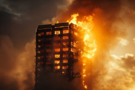 A high-rise building is on fire, engulfed in flames. ?conception of anti-terrorism