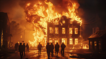 Building engulfed in flames, firefighters fighting blaze amidst smoke and chaos.