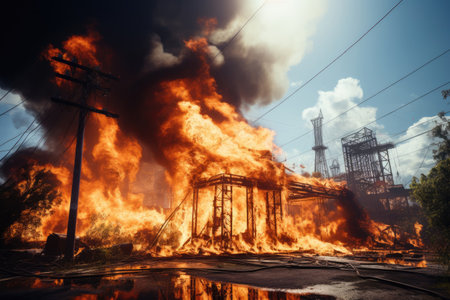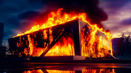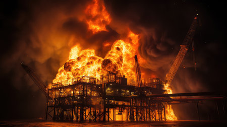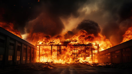 Huge flames engulfing an industrial building at night, creating a dramatic scene of destruction and highlighting the devastating power of fire