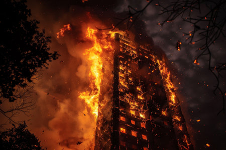 A tall building is engulfed in flames during a fire incident in London at night, Flames engulfing a tall structure in the night