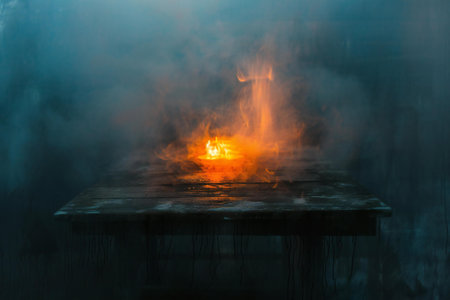 Wooden table with burning fire on the background of smoke and fog