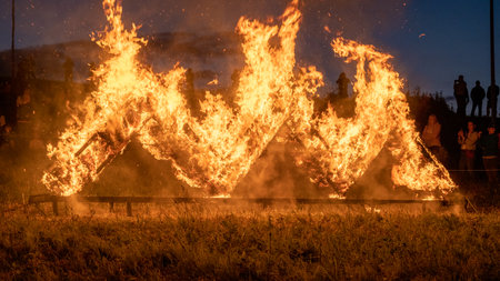 LATVIA, REKU KALNS - JUNE 21, 2022: Ethnographic traditional rituals with burning signs. Latvian Signs of Power