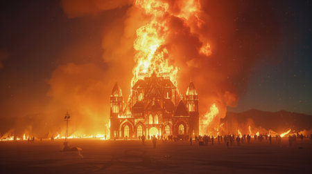 A dramatic image of a church consumed by a fierce blaze against a dark backdrop