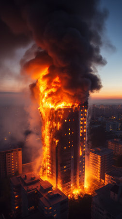 Dramatic Blaze in High Building: Striking image of a dramatic blaze raging on a floor inside a tall building, conveying the severity of the situation