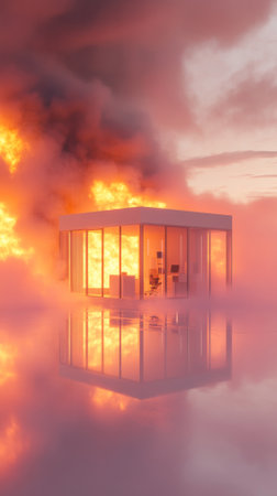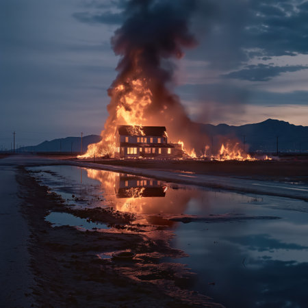 Burning house in surreal landscape with reflective water surface, concept of destruction, AI Generated