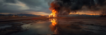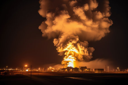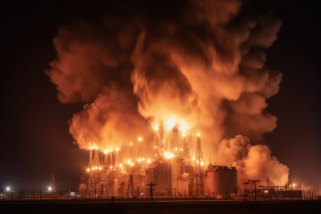 View of Big explosion and fire on power plant at night, with its bright lights and glowing smokestacks creating an eerie, almost otherworldly glow. Generative AI
