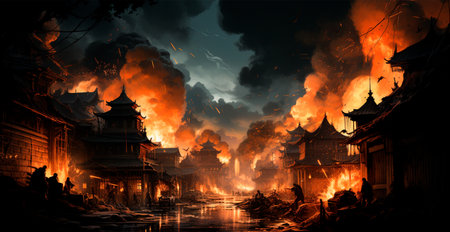 A dramatic landscape of a city engulfed in flames, with a fiery skyline reflected in a dark, still lake The scene conveys a sense of destruction and chaos