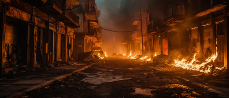 AI Generated. Ruined cityscape with fires raging under a gloomy sky