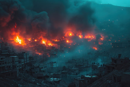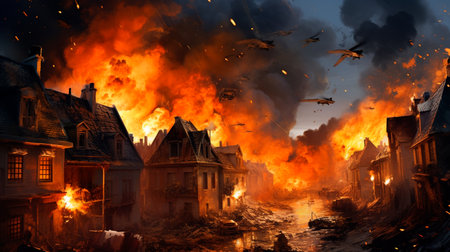A panoramic view of burning city with destroyed buildings engulfed in flames, creating dramatic and intense atmosphere. scene evokes feelings of chaos and devastation