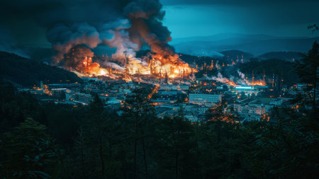 Flames engulf a large industrial area at night, casting an eerie glow over the landscape as thick smoke billows into the sky amidst nightfall