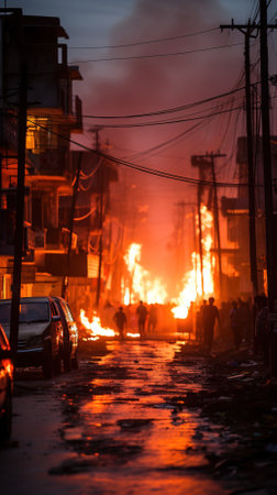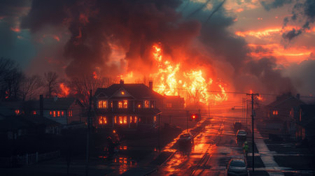 Urban Firestorm. Smoke billows over street as fire rages in urban area at dusk.