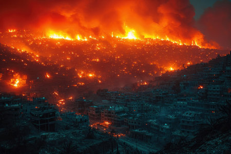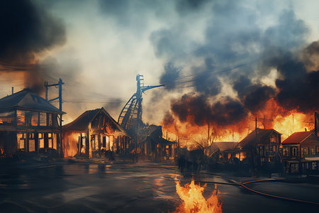 Dramatic landscape of a city engulfed in flames during a massive fire, with dark smoke rising against a fiery sky