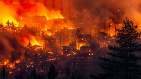 Impact of Climate Change: Urban Areas Engulfed in Flames from Wildfires and Hurricanes. Concept Climate Change Impact, Urban Wildfires, Hurricanes, Environmental Crisis, Climate Emergency
