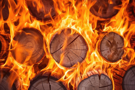 close-up of dancing flames on wood logs, created with generative ai