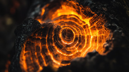 Captivating close-up of a glowing tree ring, showcasing intricate textures and natural patterns, creating an eye-catching, artistic display of nature