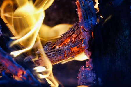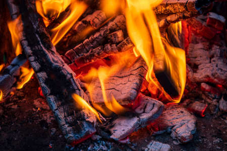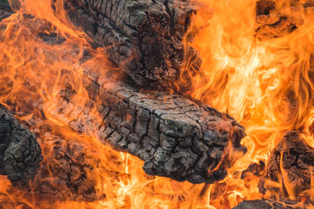 Burning wood in a campfire close-up. Selective focus. Charcoal in a bright red flame. Flashes and sparks in the fire of a forest fire. The concept of warmth and comfort.