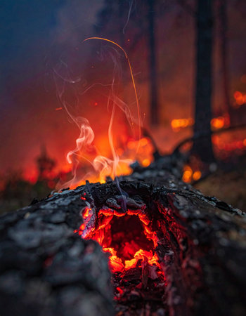 This image showcases a close-up view of burning firewood with vibrant orange embers. The composition features a textured wooden log against a dark, blurred backdrop, suggesting an outdoor setting at dusk. The warm tones contrast with cooler colors, creating a visually compelling display suitable for editorial or illustrative purposes.
