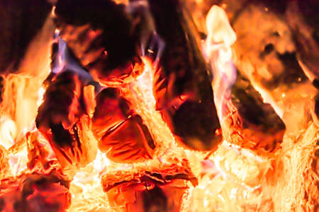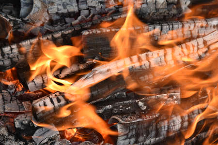 Blazing firewood in the fire coals