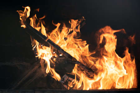 A blazing fire in the dark. Inflammation of firewood in the fire. A bright burning flames. Sparks and flames in the darkness. Red-hot heat and tongue flames. Fiery flaming bonfire.